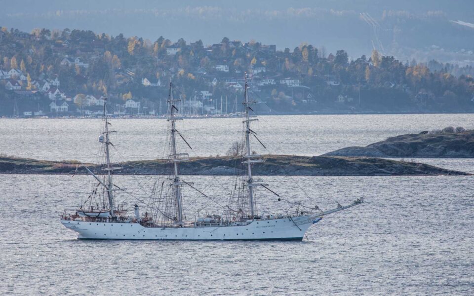 Z okna widzimy odnogę fiordu. Przez pare dni na kotwicy „parkował” tam trójmasztowy żaglowiec.