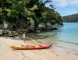 Wczoraj mieliśmy pierwszą przerwę w drodze. Zaplanowaliśmy ją aby popływać kajakiem. Konkretnie chodziło o wybrzeże wzdłuż Parku Narodowego Abel Tasman. Park chroni las, który nam przypomina dżunglę [choć nią nie jest]. Nas interesował obszar, gdzie zielsko styka się z Morzem Tasmana. Dostaliśmy naprawdę ogromniasty kajak. Nie dość, że był długaśny i miał ster jak żaglówka, to był dodatkowo nieźle wyposażony. Fartuch aby woda nie wlatywała do kajaka, zapasowe wiosło, kurtki sztormowe, pompa ręczna do usuwania wody…