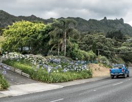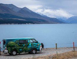 Odebraliśmy vana i ruszyliśmy. Żeby było ciekawiej od razu wjechaliśmy w góry. Ale po kolei… Każdy van firmy Escape ma na burcie inne graffiti. Nam trafiła się szalona, zielona ośmiornica 😉 Kamper okazał się mniejszy, niż się spodziewaliśmy. I w sumie nie jest to złe, bo ruch odbywa się tu po lewej stronie jezdni i mniejszym vanem śmiga się wygodniej. Zwłaszcza, że jadąc na północny kraniec północnej wyspy, od razu wjechaliśmy w kręte góry. W planach…