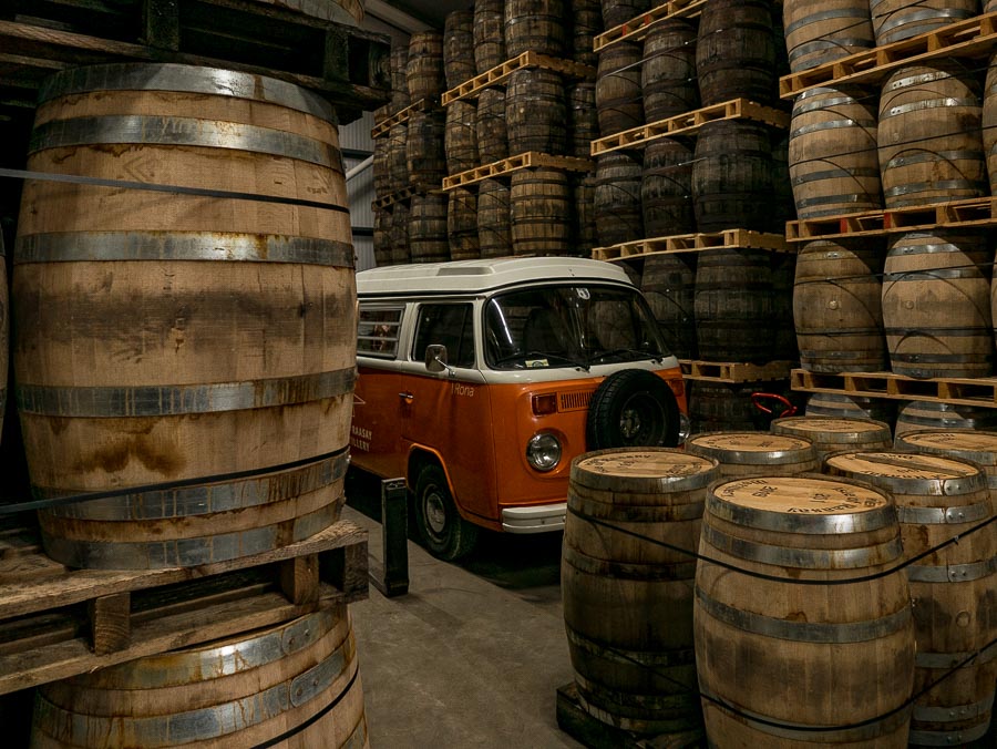 Samo leżakowanie odbywa się na wzgórzu za destylarnią. Wśród beczek swoje miejsce parkingowe znalazł poczciwy VW “ogórek”, który jest wykorzystywane przez marketing do akcji promocyjnych.